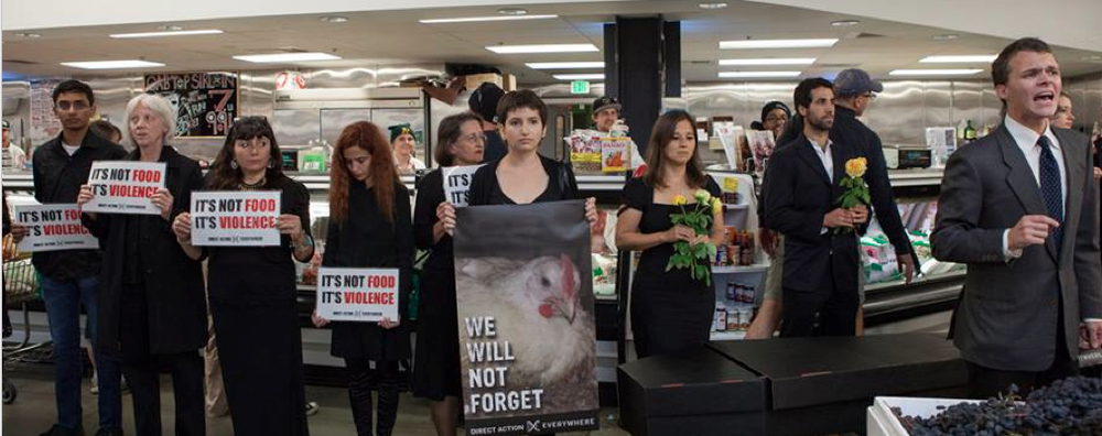 For our Ghosts in the Machine demonstration, we targeted grocery stores around the world (Bay Area activists engaged at Berkeley Bowl’s larger location). We entered the grocery stores in funeral attire, carrying a black, cardboard coffin. We then placed the body of a victim of violence—in the case of Berkeley Bowl, the corpse of a hen—into the casket and held a memorial service for her, as well as all of the victims on display in the meat and seafood counters behind us. Various activists delivered brief eulogies for the departed, and we solemnly exited the store in an organized funeral procession. (We regrettably had to place the body of the hen near the door as we exited, so as not to be criminalized as thieves.)