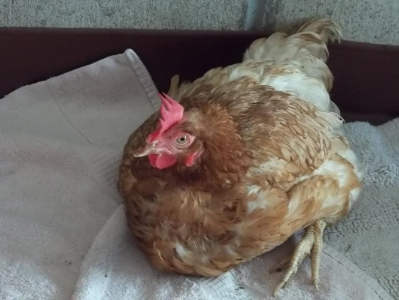 Ellie was weak. The farm had cut her nerve-filled beak so short that she couldn't even eat. She was starved. She could not walk or even stand. Her bones were weak from over-production— she needed so much calcium to produce an egg a day that her body was taking it from her bones and muscles. We had to give her wet food so she could eat, along with calcium supplements. She was in our chicken ICU for about eight weeks.