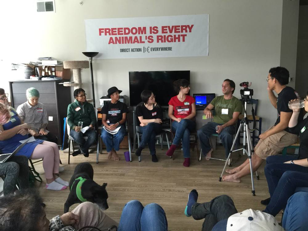 At a recent DxE open meeting, four LGBTQ-identified members of the DxE community, all of whom were people of color, came together to discuss their views on how nonhuman and human liberation struggles are connected. The presenters all recognized the importance of furthering the nonhuman animal liberation movement in a way that does not appropriate the struggles of other groups or otherwise perpetuate parallel forms of oppression. Following the set of presentations, attendees engaged in a thoughtful 45-minute Q&A session with the four panelists and later received updates and provided feedback about DxE’s latest campaign against humanewashing and consumer deception. Without further ado, please find summaries of and links to each of the four talks, which run about 10-15 minutes in length each.