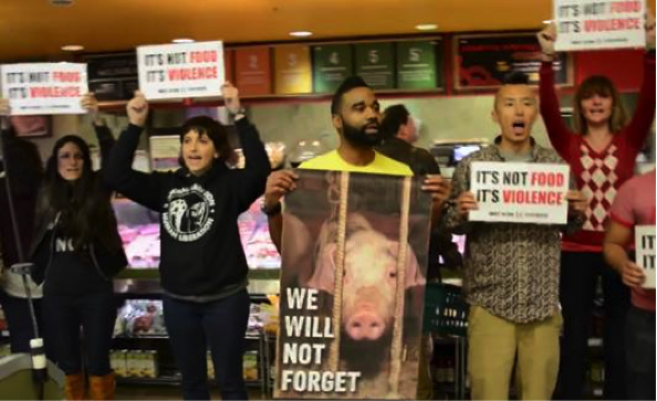 Fast forward to my story now. After being involved with coordinating DxE Connections the past three months, I found myself back home in Idaho. I was truly alone when the April day of action came, but I had my DxE family in my heart. Driven by the thought of returning to my DxE friends who were speaking out for animals around the world, I walked into the Boise, Idaho Whole Foods, stood under a sign that read "Butcher Shop" and delivered my first solo disruption. I wish I could say it was all driven by my compassion for animals, but what really pushed me out to disrupt that day was the friendships I have made at DxE.